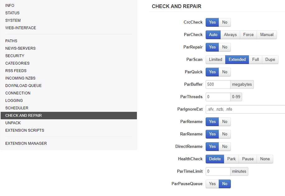 Set the amount of RAM that the par-checker may use during repair. Having the buffer as big as the total size of all damaged blocks allows for the optimal repair speed. The option sets the maximum buffer size, the allocated buffer can be smaller.