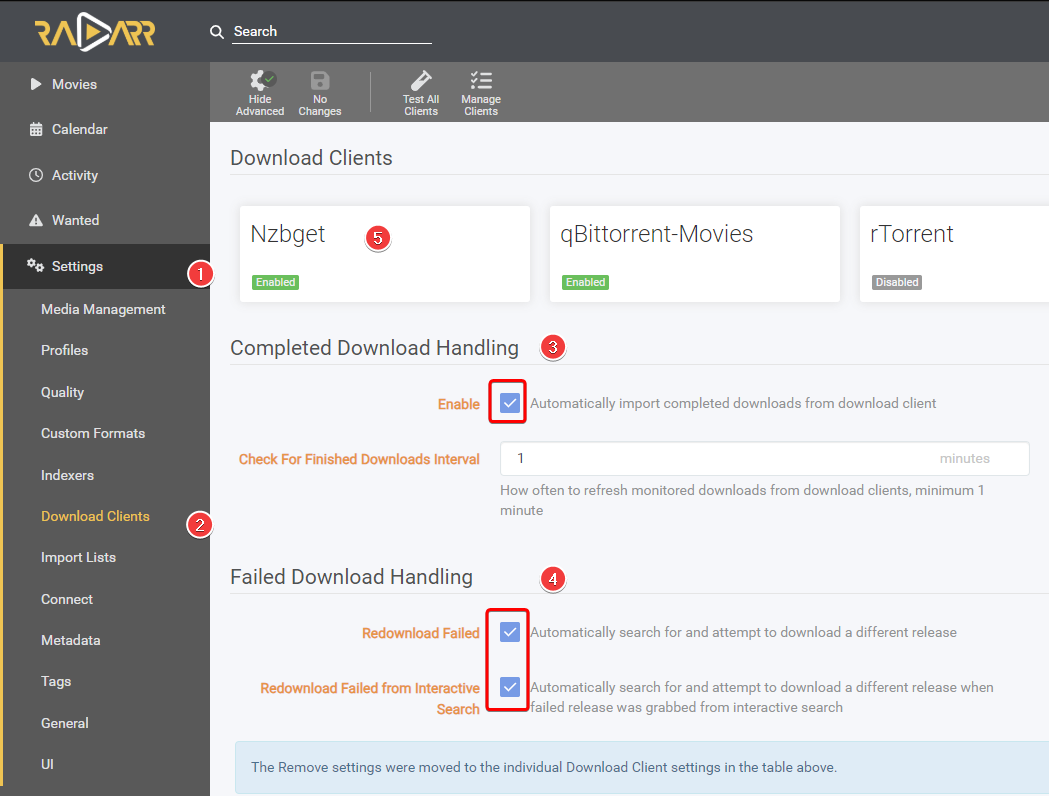!Radarr: Settings => Download Clients