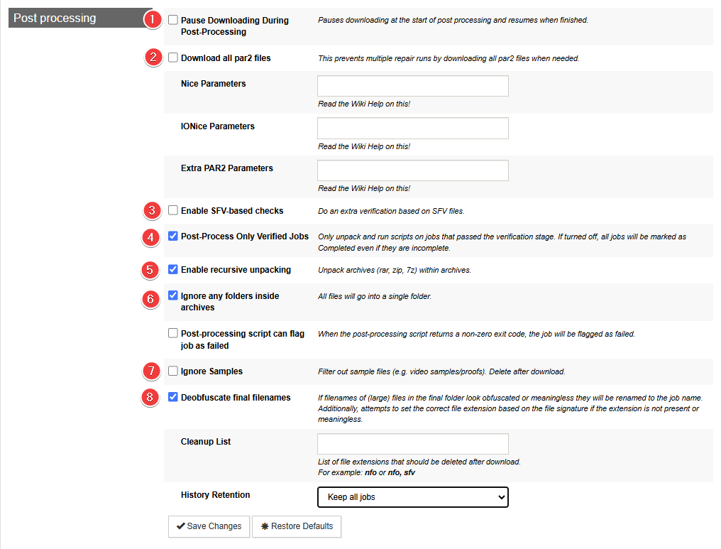 - If your hardware isn't up to snuff, including CPU and/or IO performance, disabling Direct Unpack and/or enabling Pause Downloading During Post-Processing can help. Defaults are fine for most hardware though.