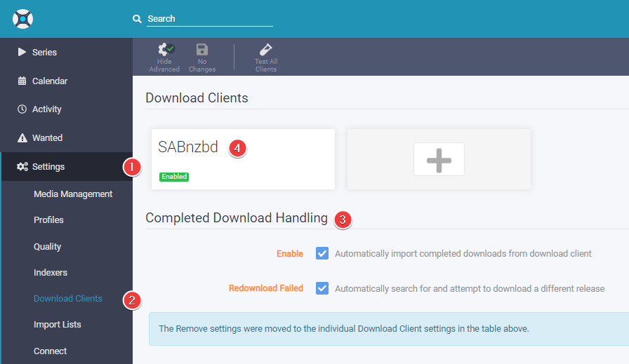 Select SABnzbd in step 5 and scroll down to the bottom of the new window where it says Completed Download Handling and check both boxes.