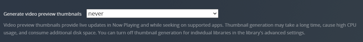 1. This option creates a series of preview thumbnails from a media item when it is analyzed. These images are used by some Plex apps when you move back and forward in an app with the timeline scrubber. They’ll also be displayed in Now Playing when someone is streaming from you so that you can see where they are in the video.