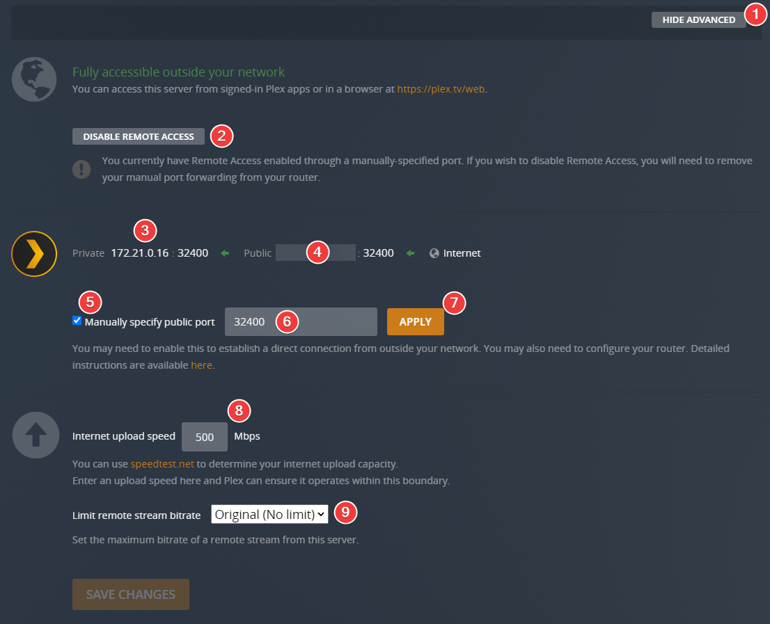7. Click on Apply and when everything is set up correctly, your Plex Media Server should be fully accessible outside of your network, so you can connect to your Plex server from outside. You may also need to configure port forwarding on your router. Detailed instructions are available HERE.